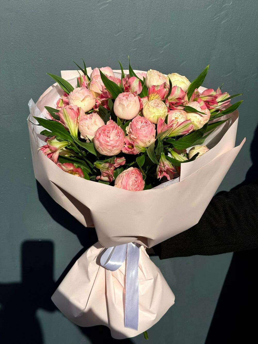 5 кустовых пионовидных роз Мэнсфилд Парк + 6 розовых альстромерий с оформлением